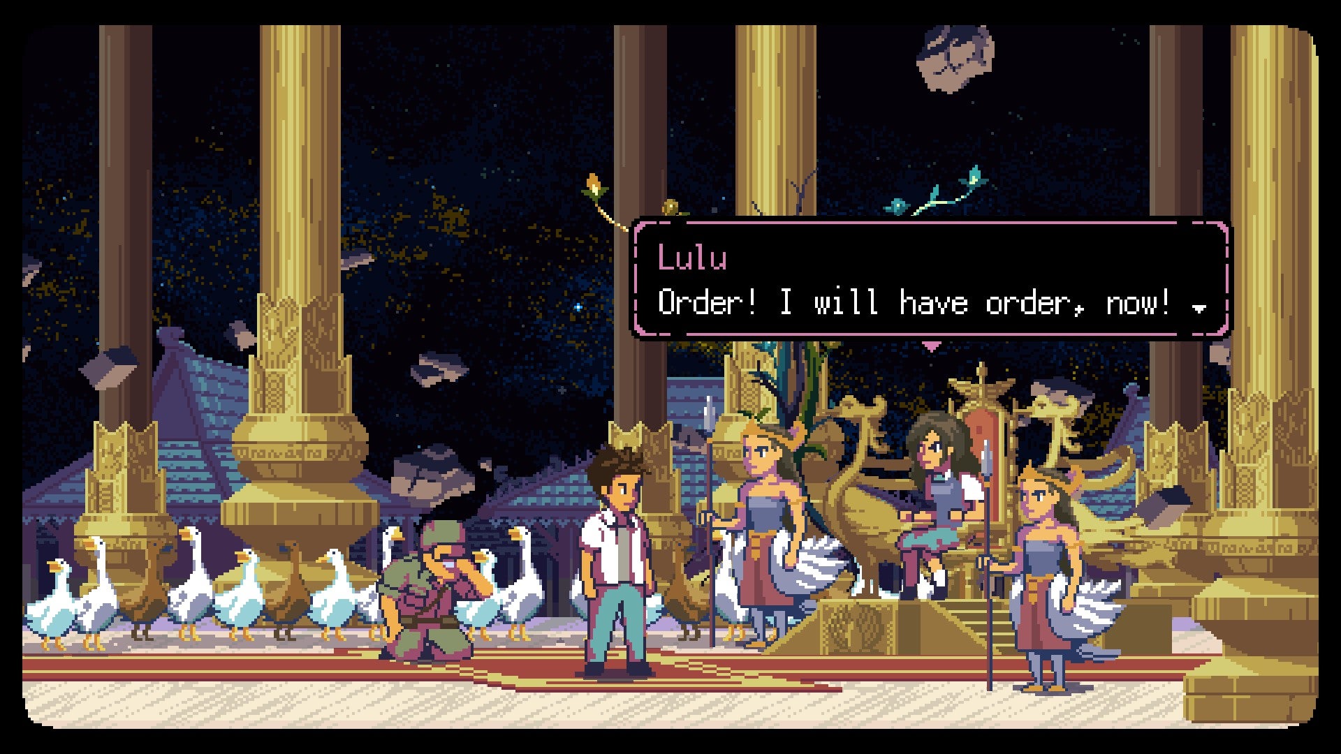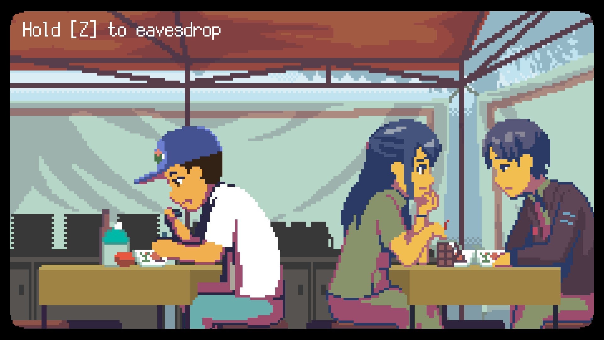 Fetch quests can, of course, be a bit of a chore in games like this, but A Space For The Unbound deftly manages to avoid slipping into any untoward pacing slumps. Mini-games such as sneaking past teachers as you try to slip outta school, eavesdropping on conversations in a red-light-green-light-style series of button holds, and even choreographed fight sequences all help break up the pace during your adventure, and there’s even a courtroom scene that does an excellent Ace Attorney impression at one point.