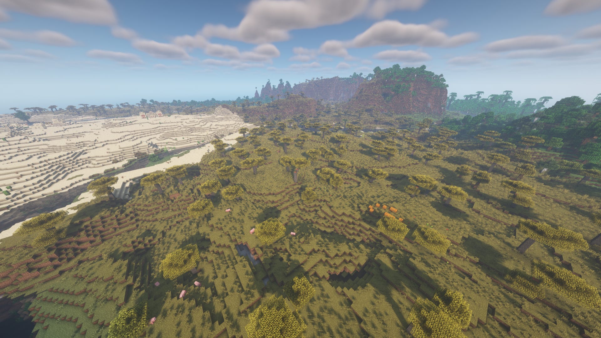 If you love Savanna biomes as much as I do, then you'll adore this starting seed. Located right on the edge of a desert housing both a Pyramid and a Village in plain sight, this sprawling Savanna is also overlooked by a wonderful valley of forest mountains. These mountains would make for a fantastic spot to build a Minecraft castle or some other majestic build.