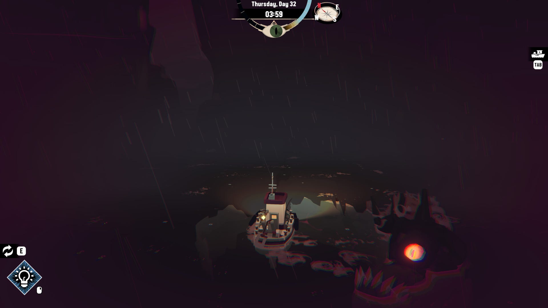 It's a compelling upgrade curve that Dredge sustains brilliantly for the length of its 12-odd hour run-time. Partly because the outer reaches of The Marrows practically demand it, with their distinct, far-flung archipelagos requiring faster, nippier sailing times if you want to get there in a single day, but also because the sight of a new silhouette billowing beneath the surface never fails to draw the eye. This is especially true at night, when the dreaded 'aberrations' start to emerge. The regular fish are pretty enough to look at during the day, but these three-eyed, two-headed, bulbous-bellied monstrosities are truly fascinating, their car-crash designs impossible to look away from. Heck, one looks like it's flopped straight out of Alien, which I'll never be able to unsee for the rest of my life. They cast a spell over you the moment you pull one of them up: the twang of the soundtrack lilting into a minor key, their startling pink inventory grid staring back at you from your cargo hold, and their heinous, beautiful artwork. All tiny details in isolation, but together they form an intoxicating current you can't break free from. Something in the air has shifted, and you will not rest until you get to the bottom of it.