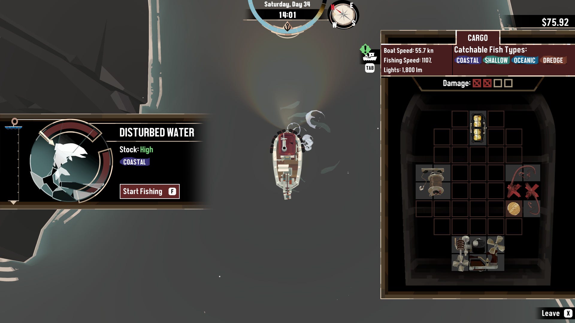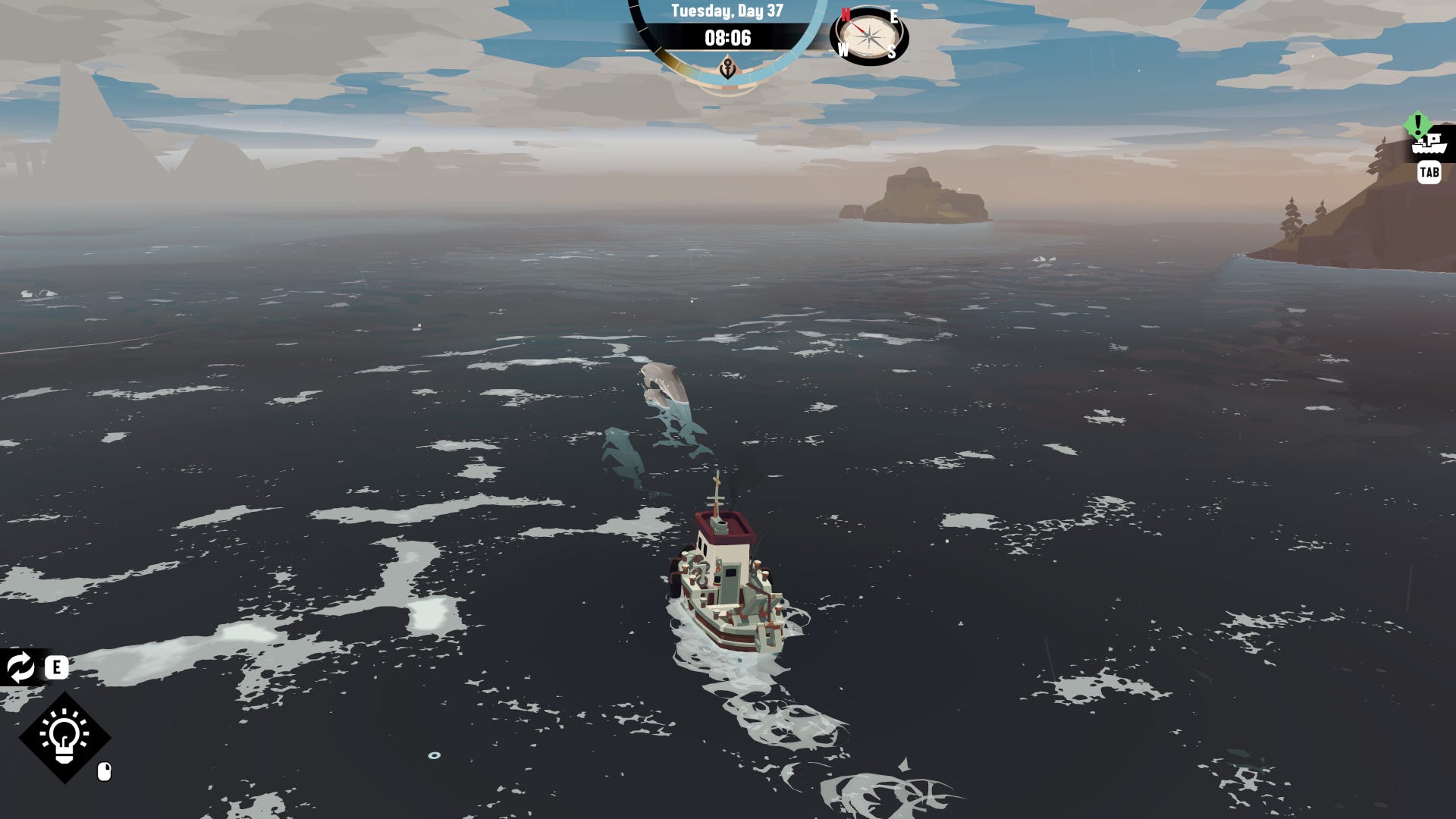 Before you can ask what the hell he means, you're thrust out onto the ocean, your tiny trawler put-put-putting around the shallows. Eye-catching splashes and ripples punctuate the waters before you, making it easy to grasp where you'll need to cast your rod. So far, so good. Everything seems hunky dory in this picturesque little cove, but the plainful soundtrack immediately sets you on edge. This is no Moonglow Bay or 3D, waterborne Stardew Valley. This is something else. Something cursed, and perhaps distantly related to Failbetter Games' Sunless Sea - but already, you feel something's lodged in your flesh. A seed - a hook - of ghoulish delight and curiosity.