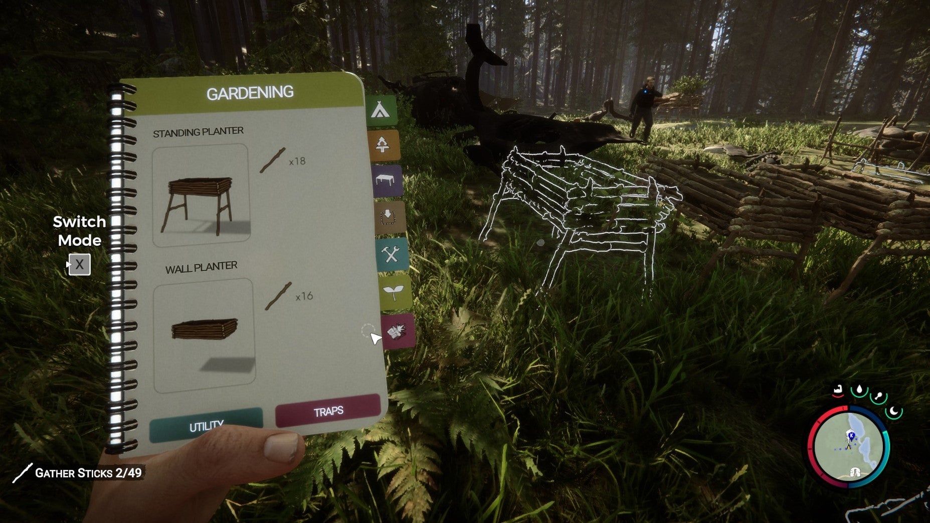 It all started when I learned that Sons Of The Forest has a peaceful mode, which completely removes all the gross, yucky cannibals, leaving you to grapple with survival in relative peace and quiet. The first time I met up with Kelvin and we got to work, casually making our shitty shelter and stick storage, I perused the guidebook to see what’s next, and I spotted a planter. A planter? Okay, so I assume you can plant seeds and grow food, then? That’s really co-WAIT, wait, wait. You're telling me this is basically a farming sim?