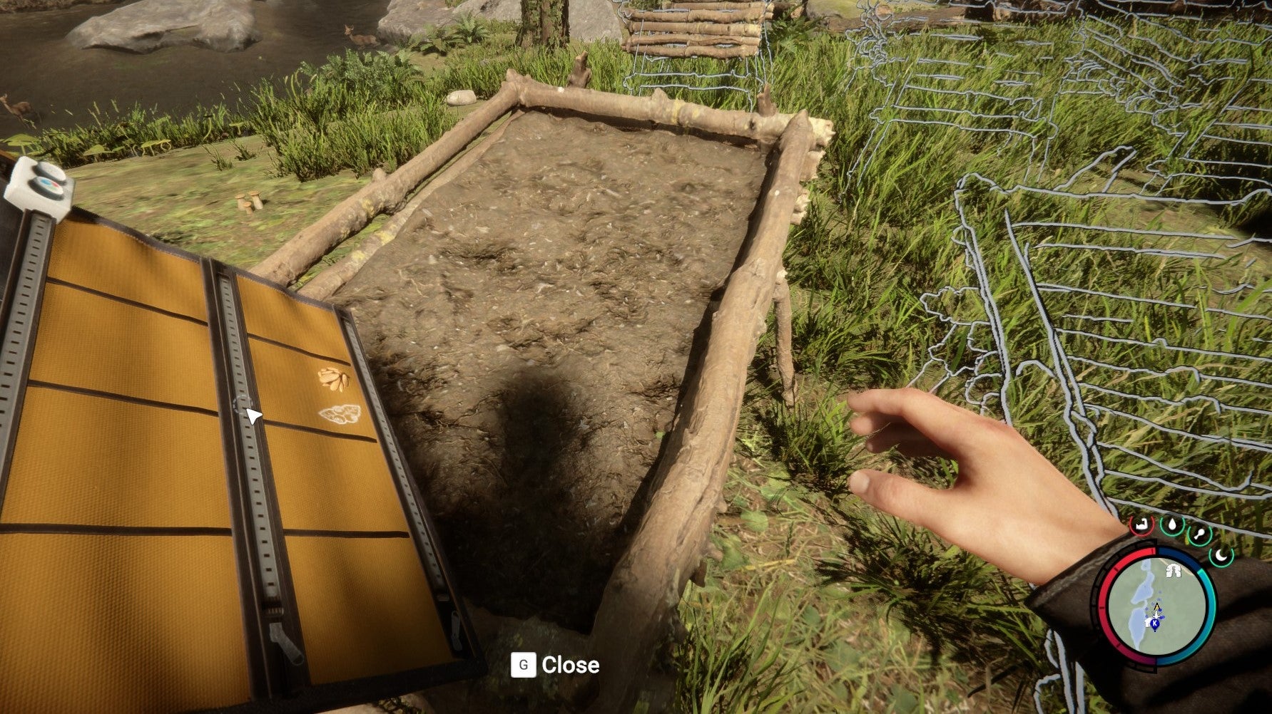 First I made Kelvin clear a 5x5 area, then I set about laying out my farm. I decided to start small, placing down eight ghostly outlines of planters, a goal for Kelvin and I to work toward. Each planter needs 18 sticks, so, hmm, yup, that’s... that's 144 sticks. My God. After finding the first 50 or so, I began to struggle, the ground foliage washing into a singular greeny brown blur - but eagle-eyed Kelvin always managed to find a shit-tonne. No idea where he was getting them from, but it quickly became obvious that this blueberry empire would not be possible without him. I would repay him in the finest blueberries my farm would grow. By the end of the first day, the eight planters were complete, seeds nestled in their beds, and it was time for me to get into my own bed, too.