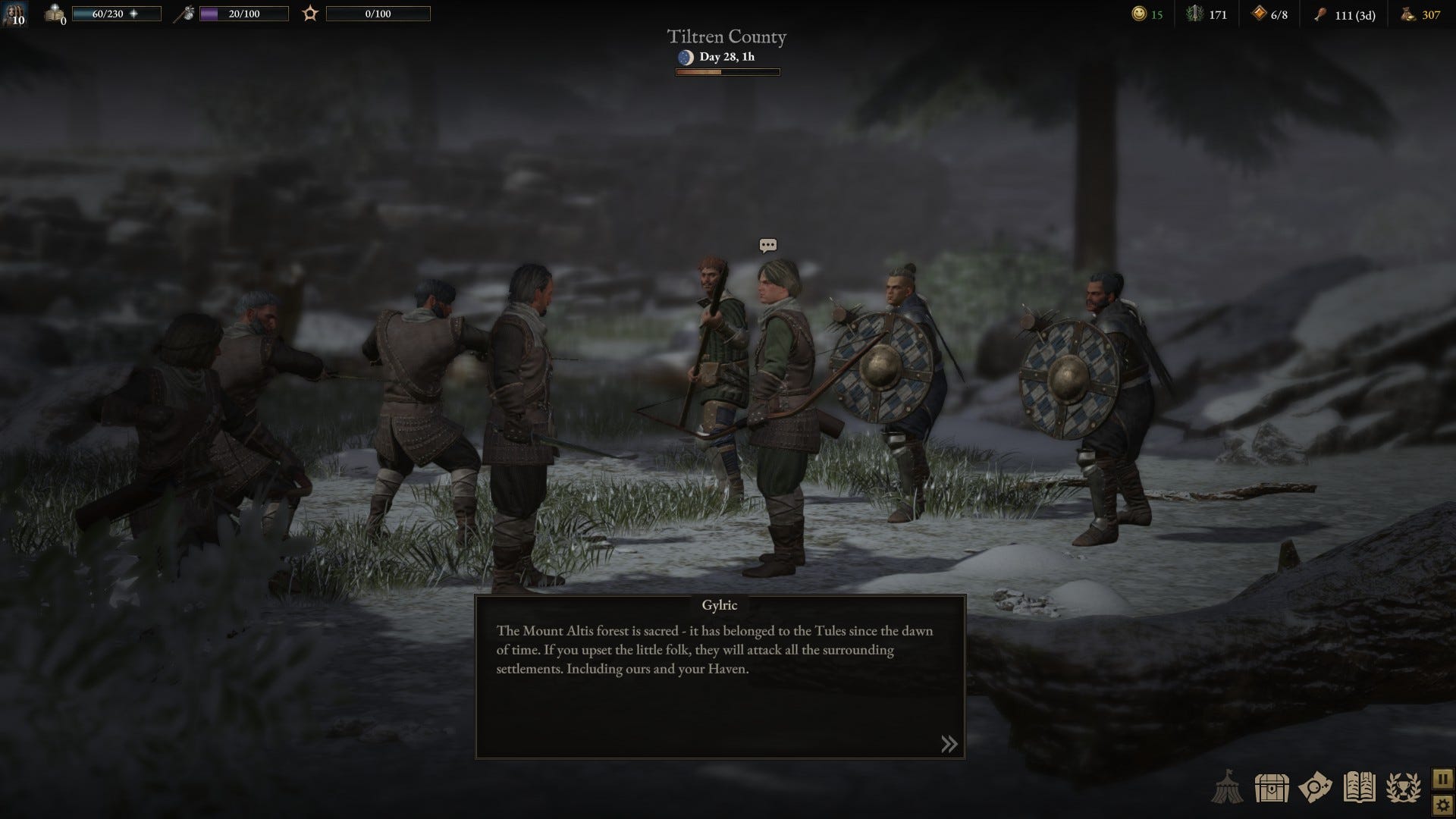 Now, here’s something you never want to say about someone you’ve eaten: this was not the last I saw of The Tank. I’d throw him in the pot along with some berries I’d brought at the market, and some fish I’d caught through a minigame fun enough to make me take a note that said “why is the fishing better than Dredge, a game about fishing?!?” My troupe would feast, sleep, and then I’d find The Tank’s corpse back in my inventory again. The boring explanation involves bugs, but I like to think my gang treated his decomposing remains as a sort of communion wafer, nibbling on his flesh with ascetic restraint. I eventually foisted the half-eaten lump on a blacksmith whose face I didn’t like for a single gold piece which I then spent on wine. Welcome to Wartales.