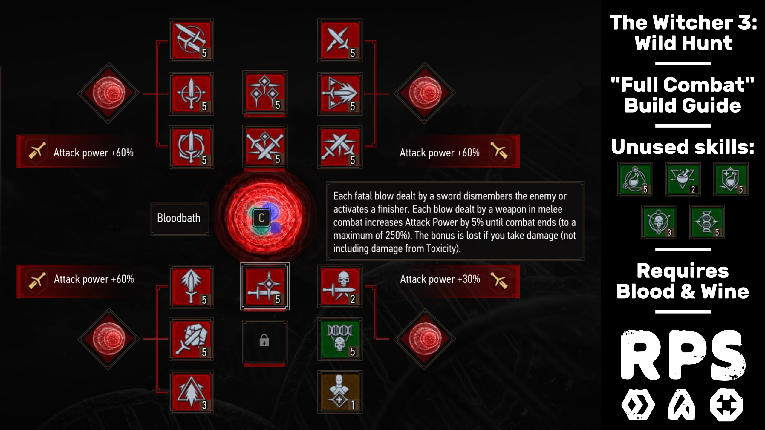 This build takes skills almost exclusively from the combat tree, but it also delves just far enough into alchemy to unlock the fantastic Synergy skill, which dramatically increases the attack power that this build provides (from 140% to 210%!). And topping it all off is the magnificently powerful Bloodbath mutation, which - like the build itself - rewards evading damage with mountains of attack power.